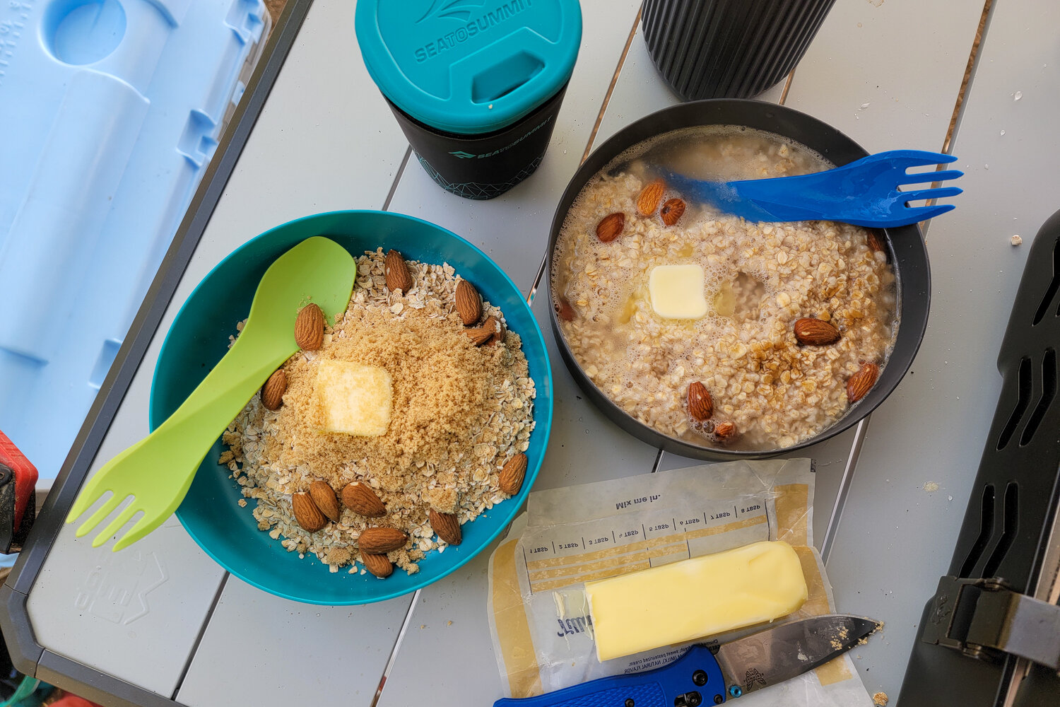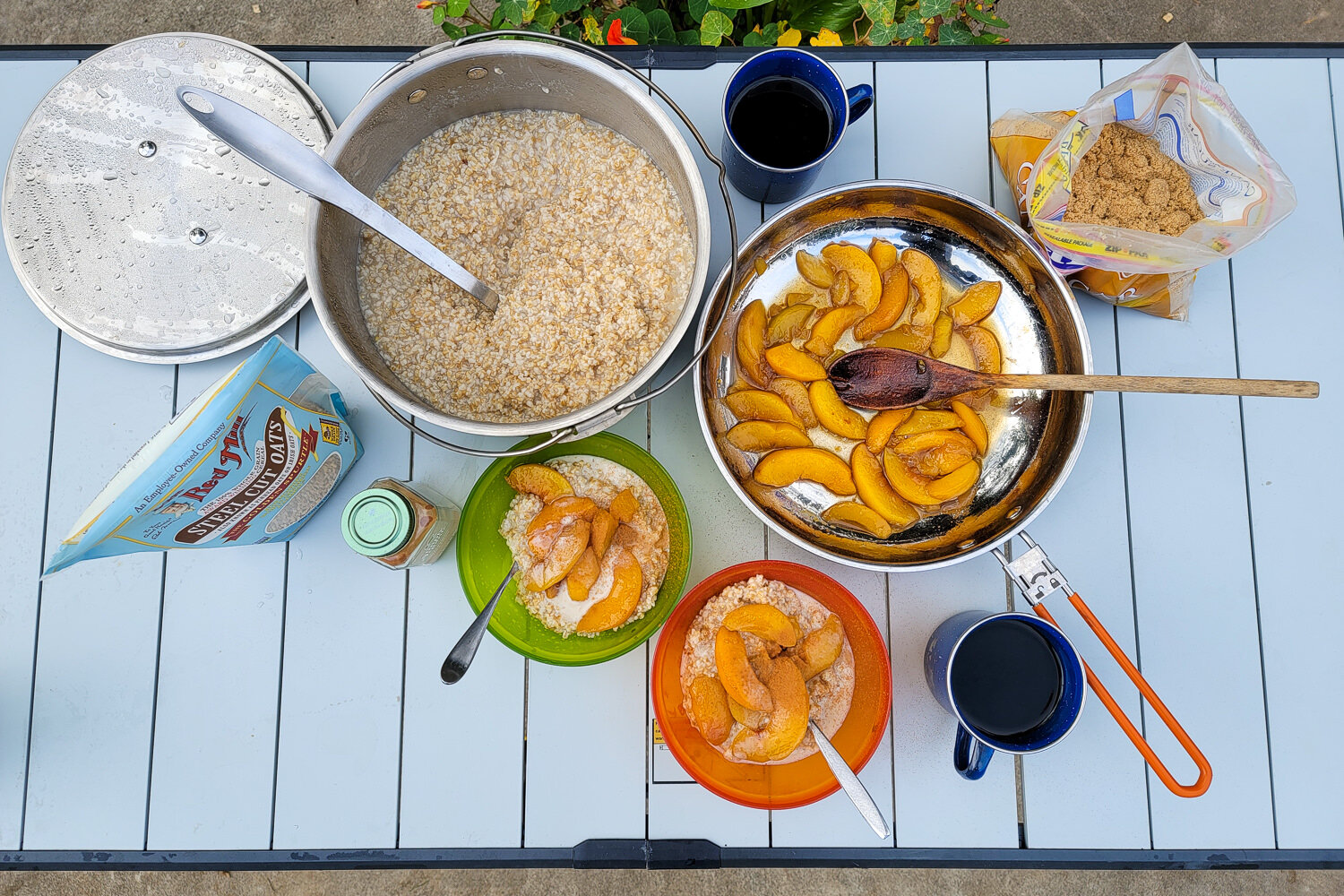 We look forward to the tradition of making steel-cut oats with peaches on camping trips in cool weather. It’s affordable, warms the belly, and is incredibly easy to make for a group.