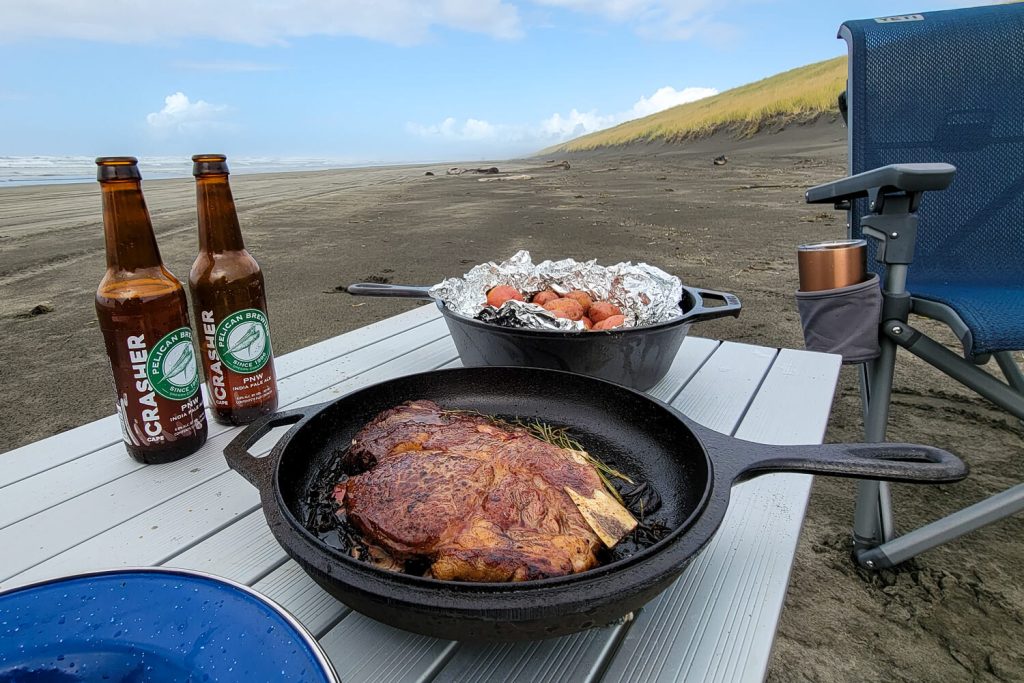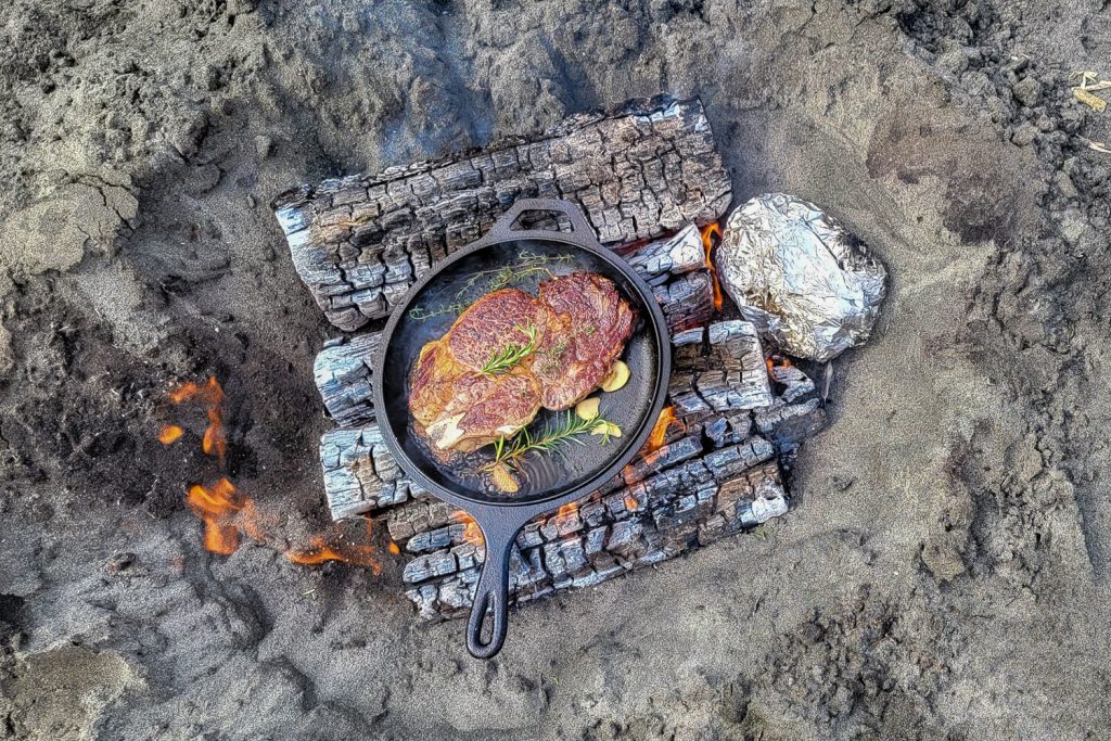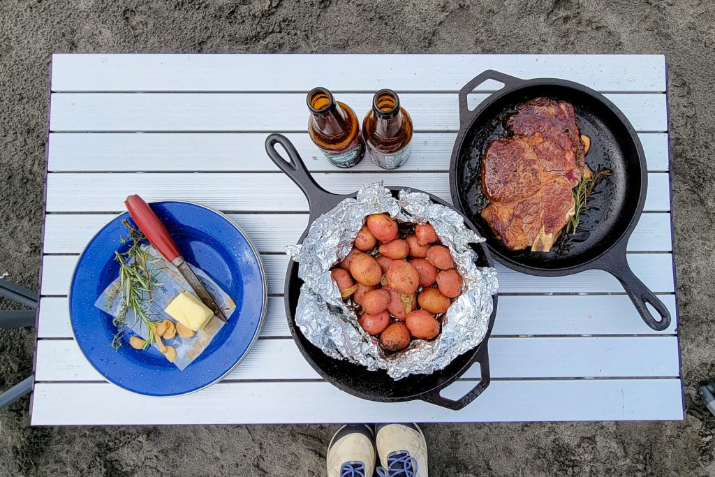 Steak and potatoes make a hearty and luxurious camping meal. Our favorite way to cook steak is over a bed of coals in a cast iron skillet. That said, a frying pan on a camping stove is more convenient and offers more control if the timing or setting isn’t right for a campfire.