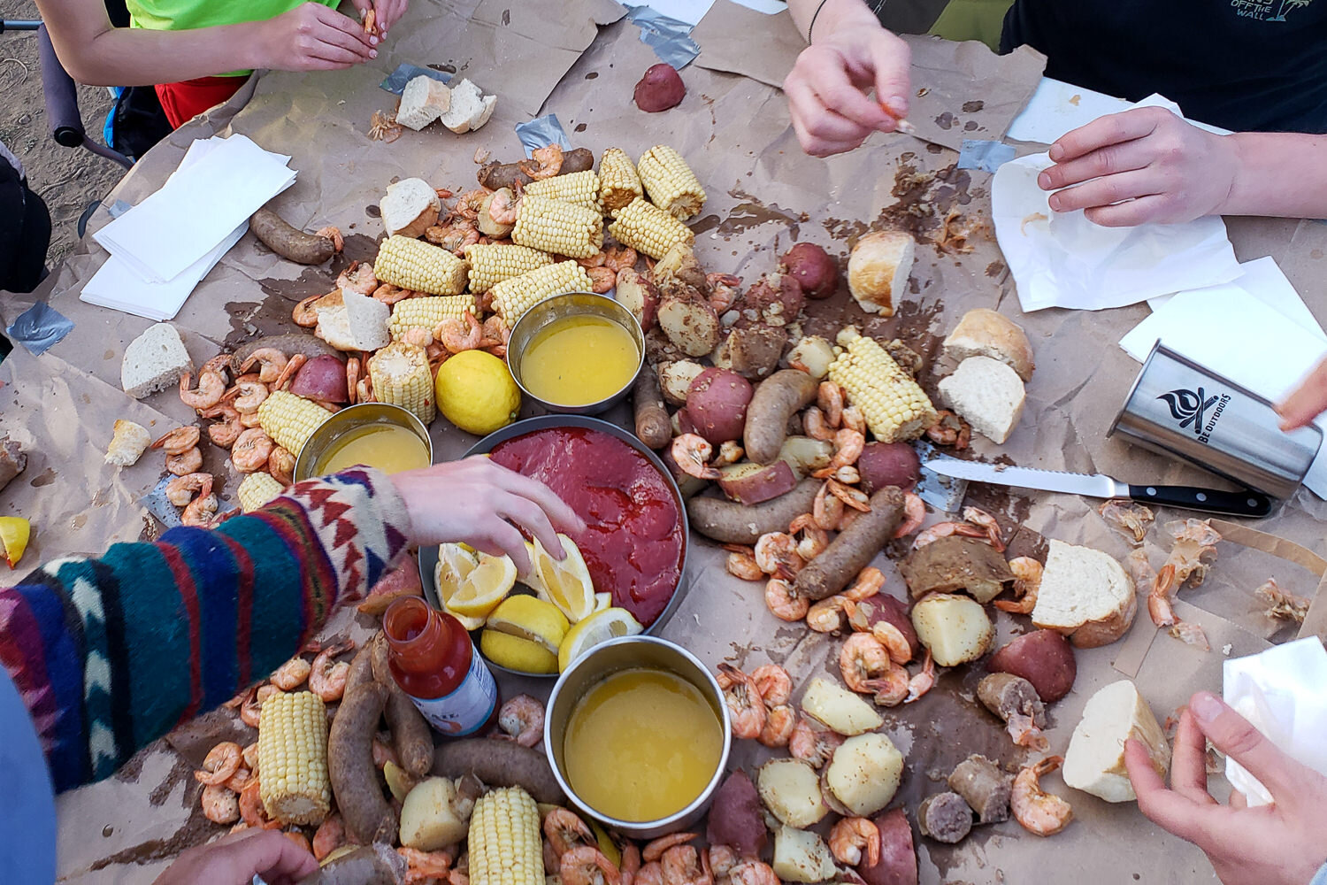 Once you can easily pierce a potato with a fork, pour everything carefully through a strainer. Save the liquid in a gallon bag in the cooler to make amazing chowder later. We like to pour the food onto a table covered in several layers of butcher paper so everyone can gather around and dig in, but you could also dish it onto plates from the pot. Sprinkle everything with more seasoning and serve with sliced French bread, melted butter, cocktail sauce, and lemon wedges. If there are any leftovers, sort it into bags and save it for omelets the next morning with tangy Cilantro Lime Crema sauce.