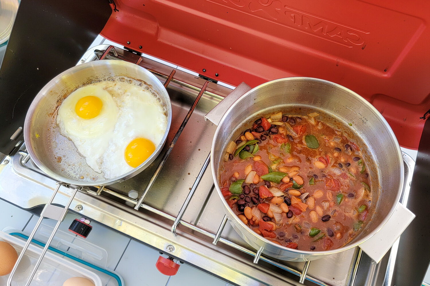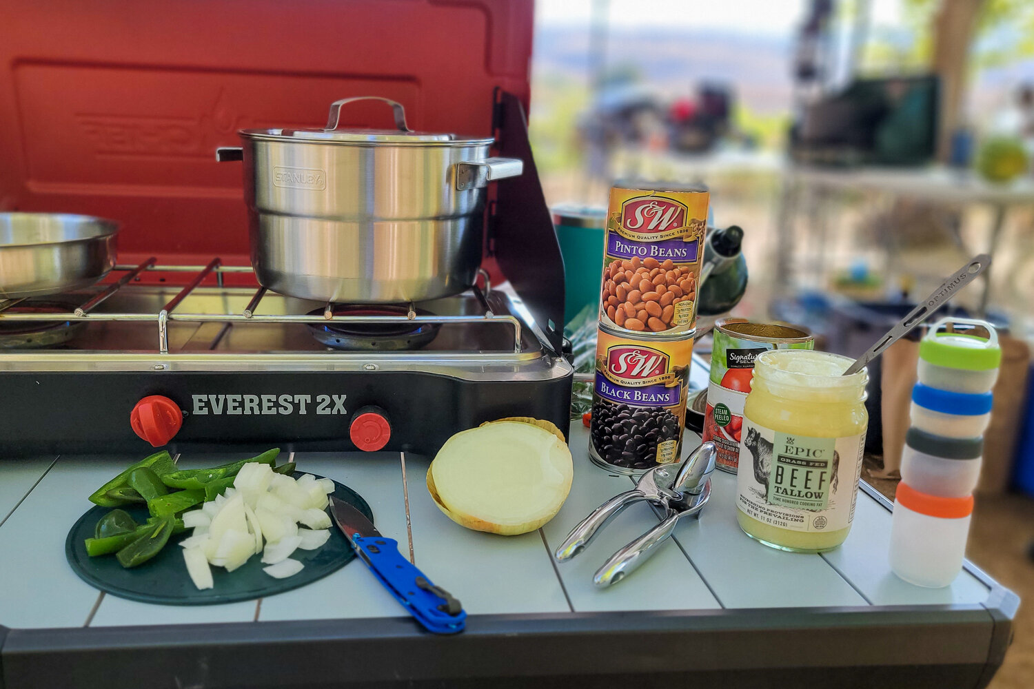 To make beans and eggs in camp: Simmer canned beans on the stove (don’t drain) with a generous spoonful of oil or fat of your choice. We like using tallow for flavor and long-lasting sustenance.